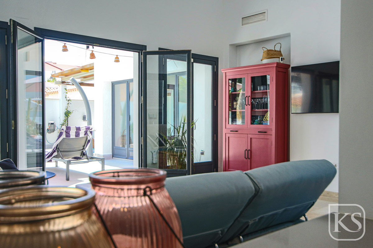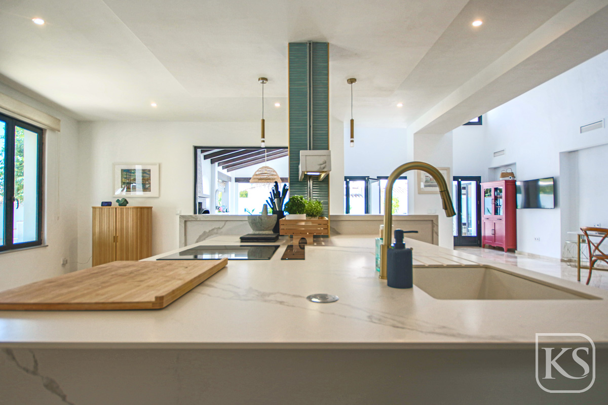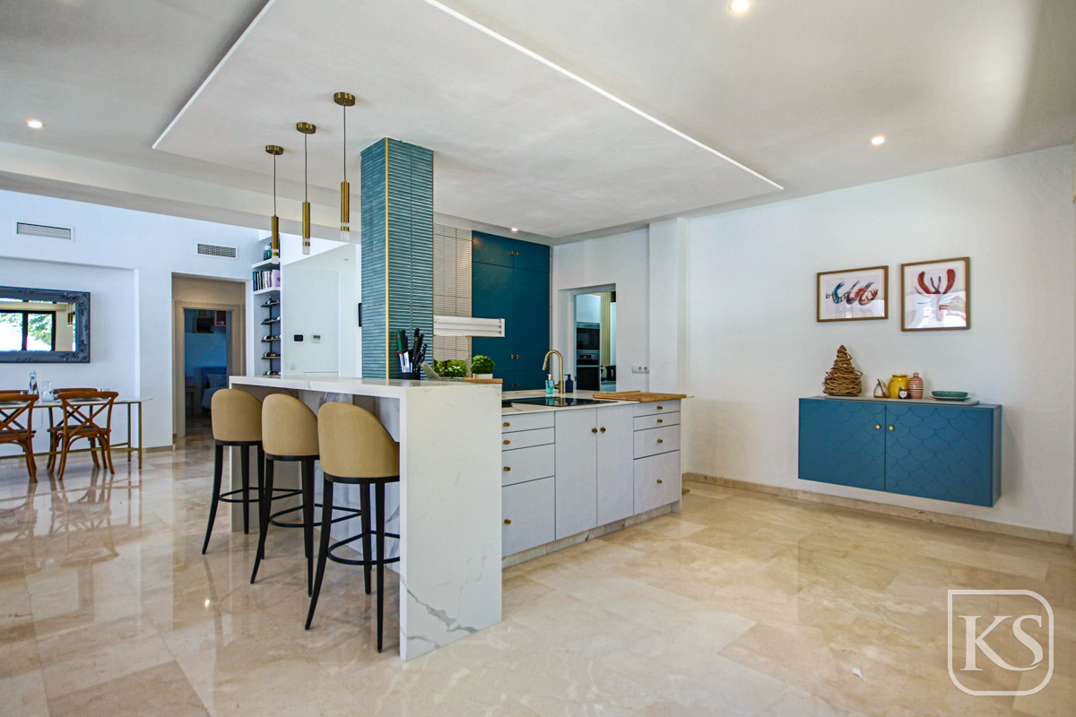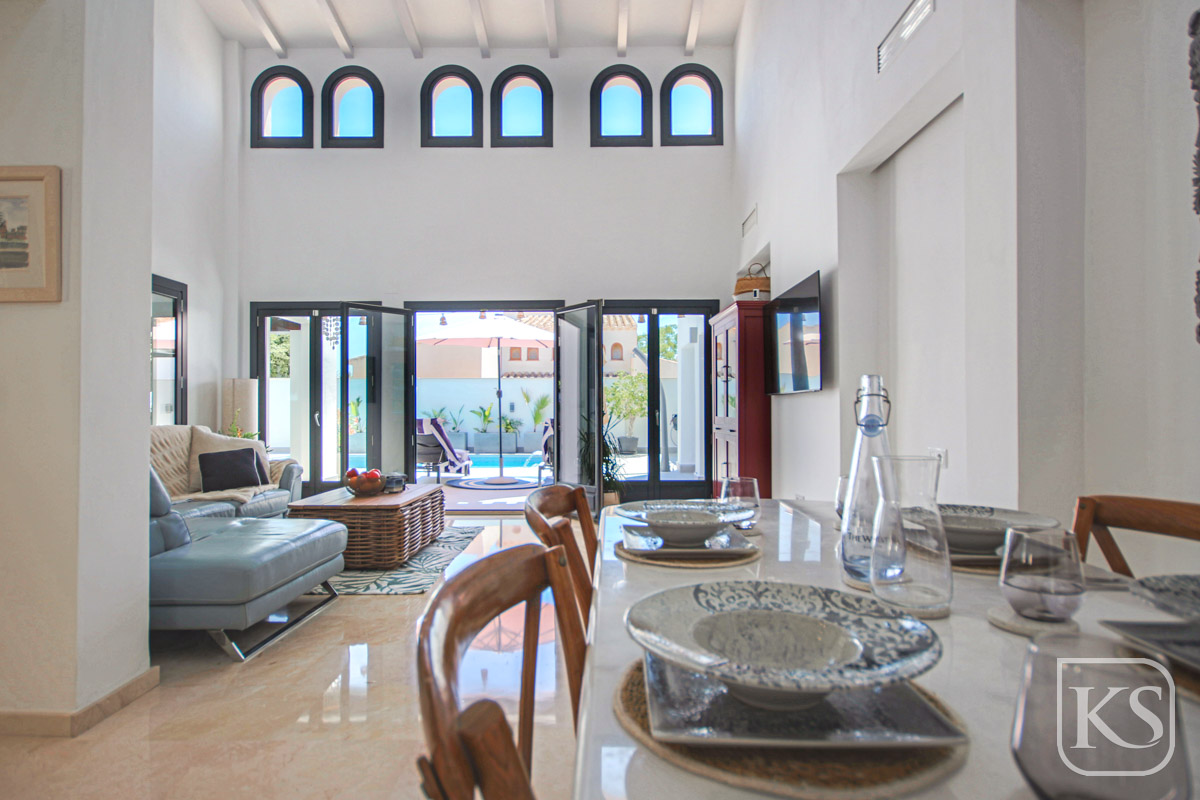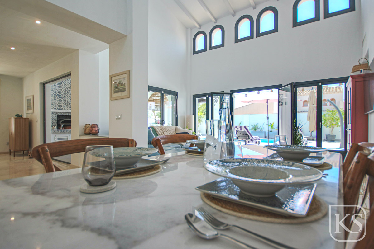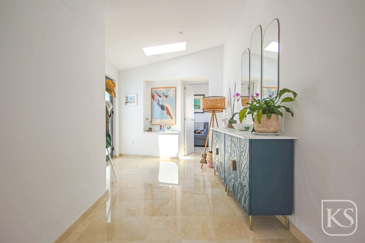 Step inside and feel the bright, airy ambience created by the fresh renovation, new tiling, and carefully curated décor. The villa features an extended entrance hallway leading into a spacious open-plan kitchen, living, and dining area.