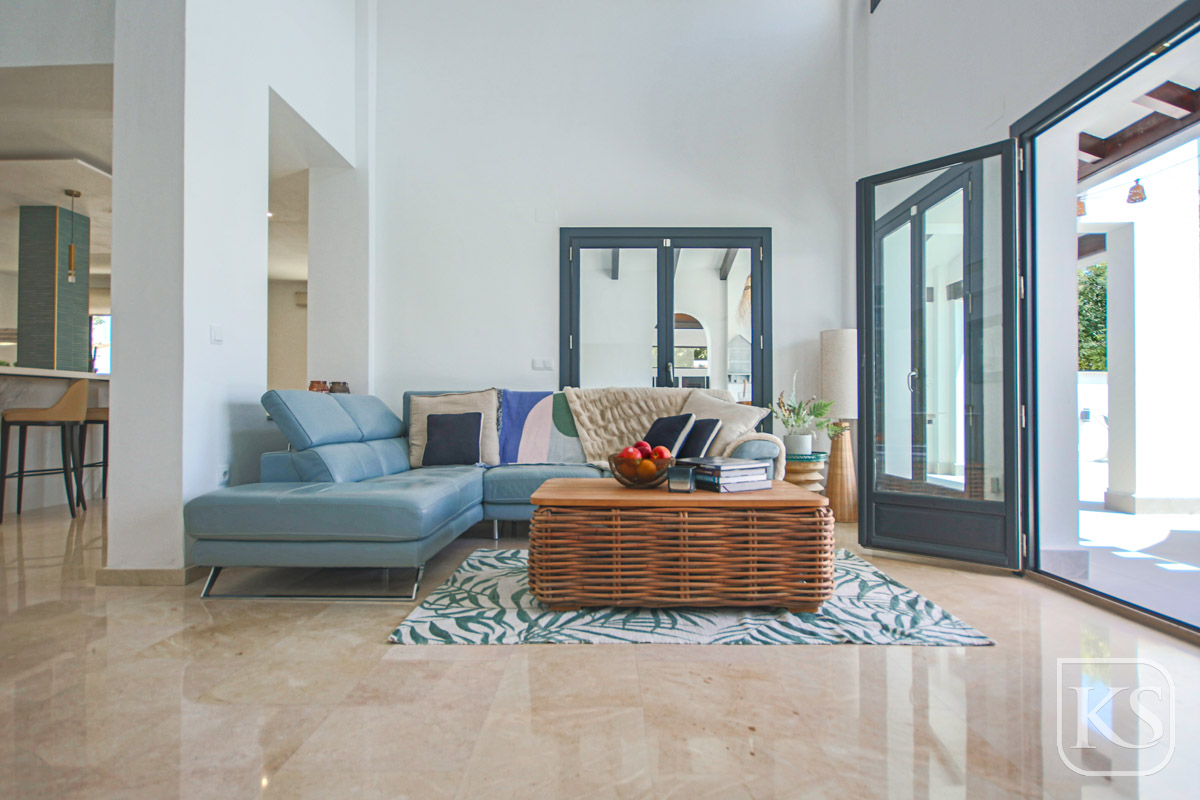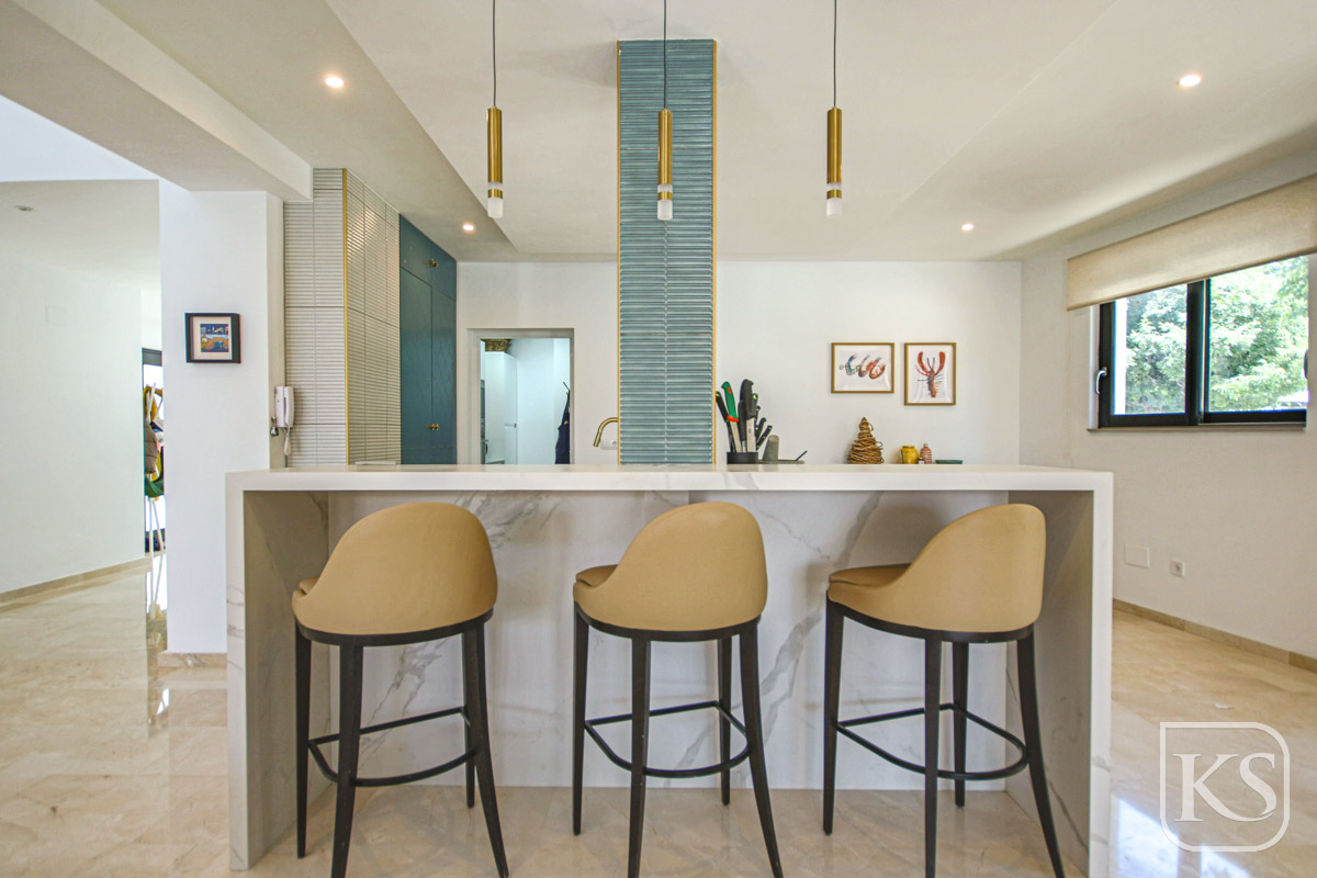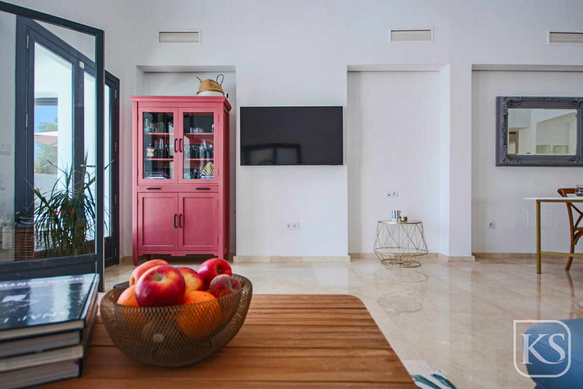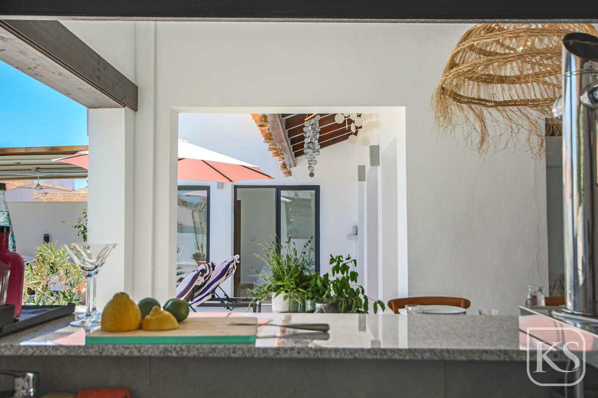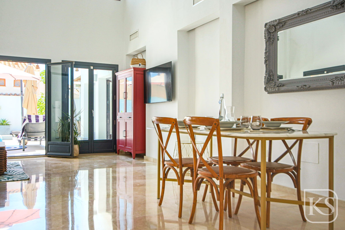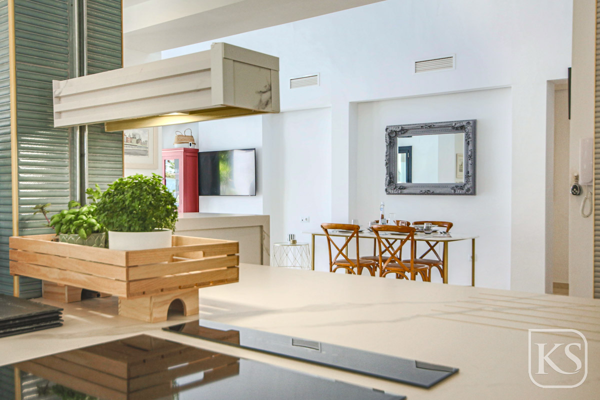 Step inside and feel the bright, airy ambience created by the fresh renovation, new tiling, and carefully curated décor. The villa features an extended entrance hallway leading into a spacious open-plan kitchen, living, and dining area.