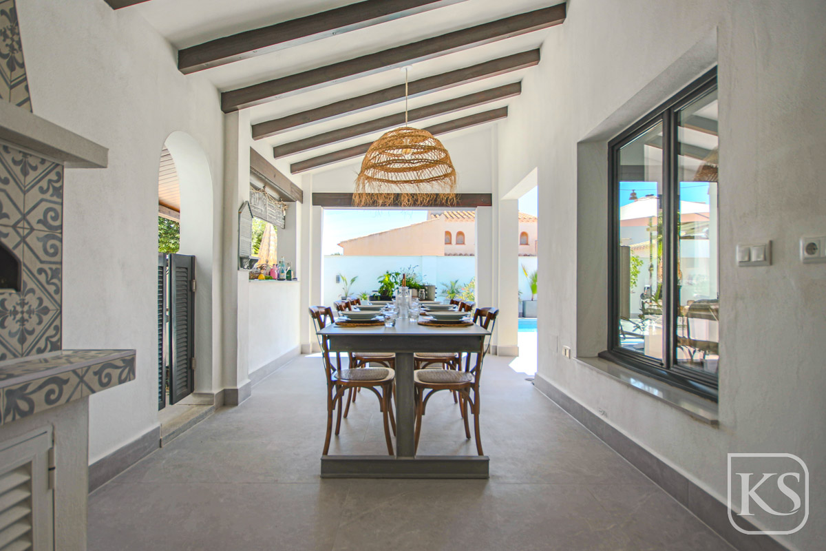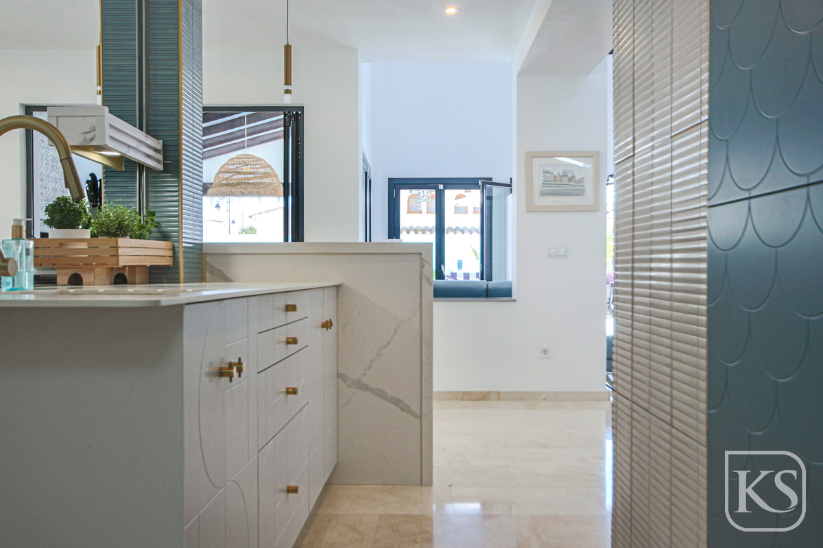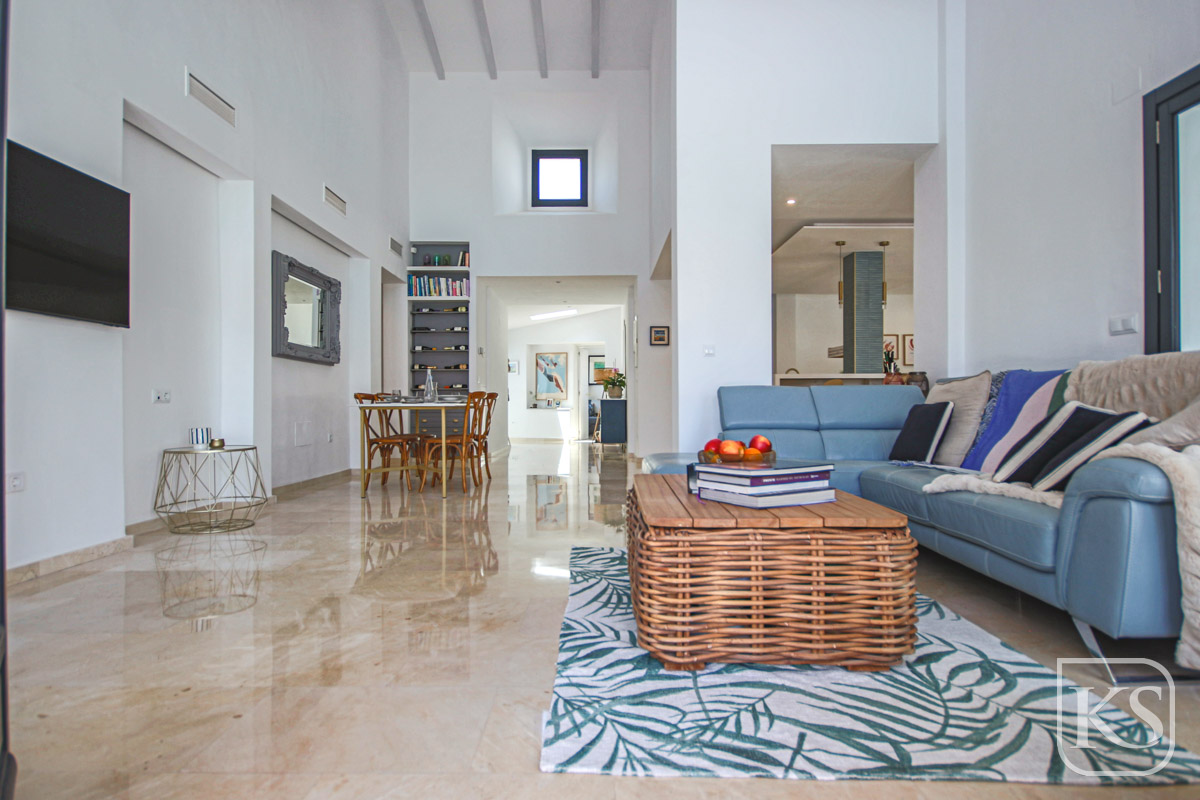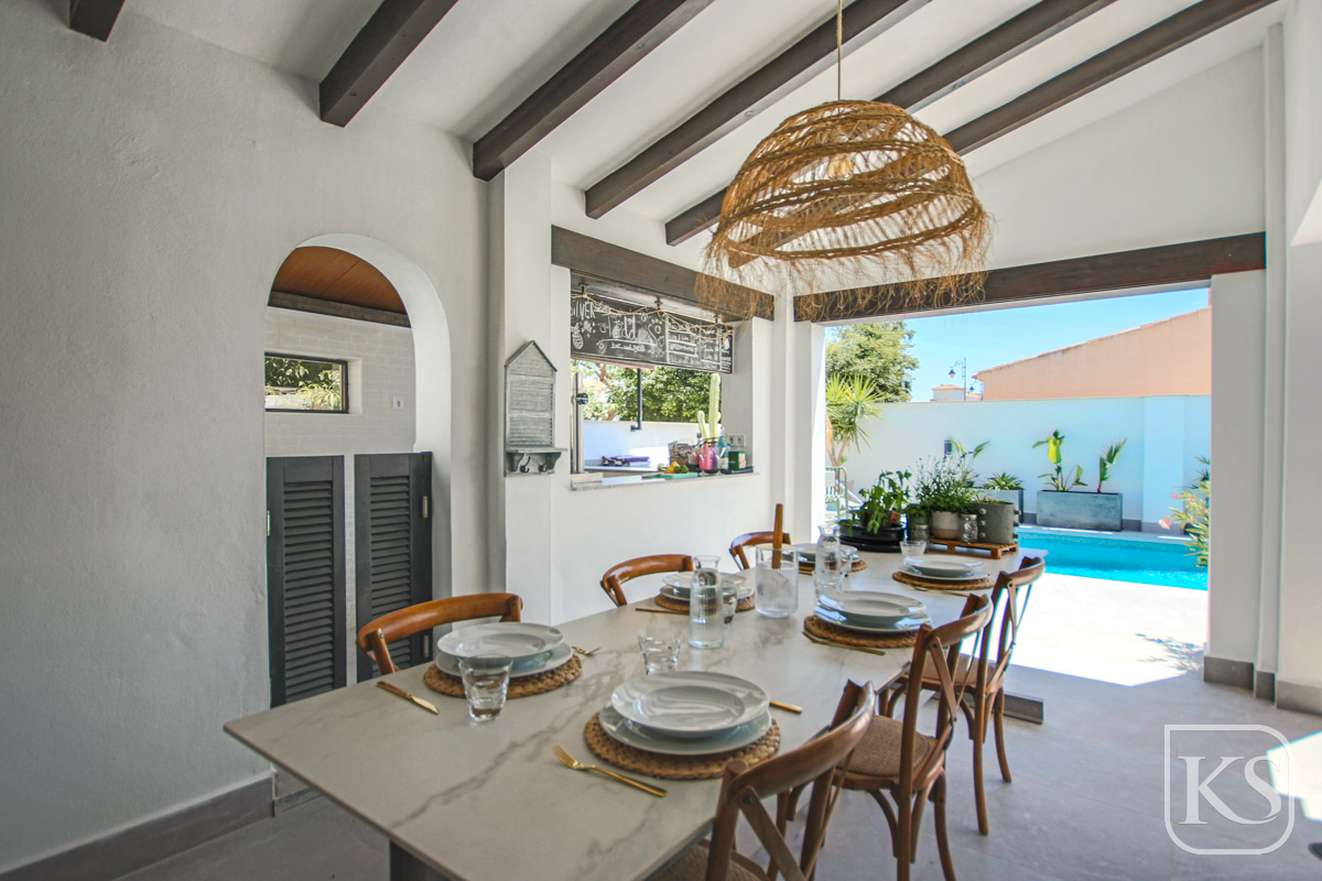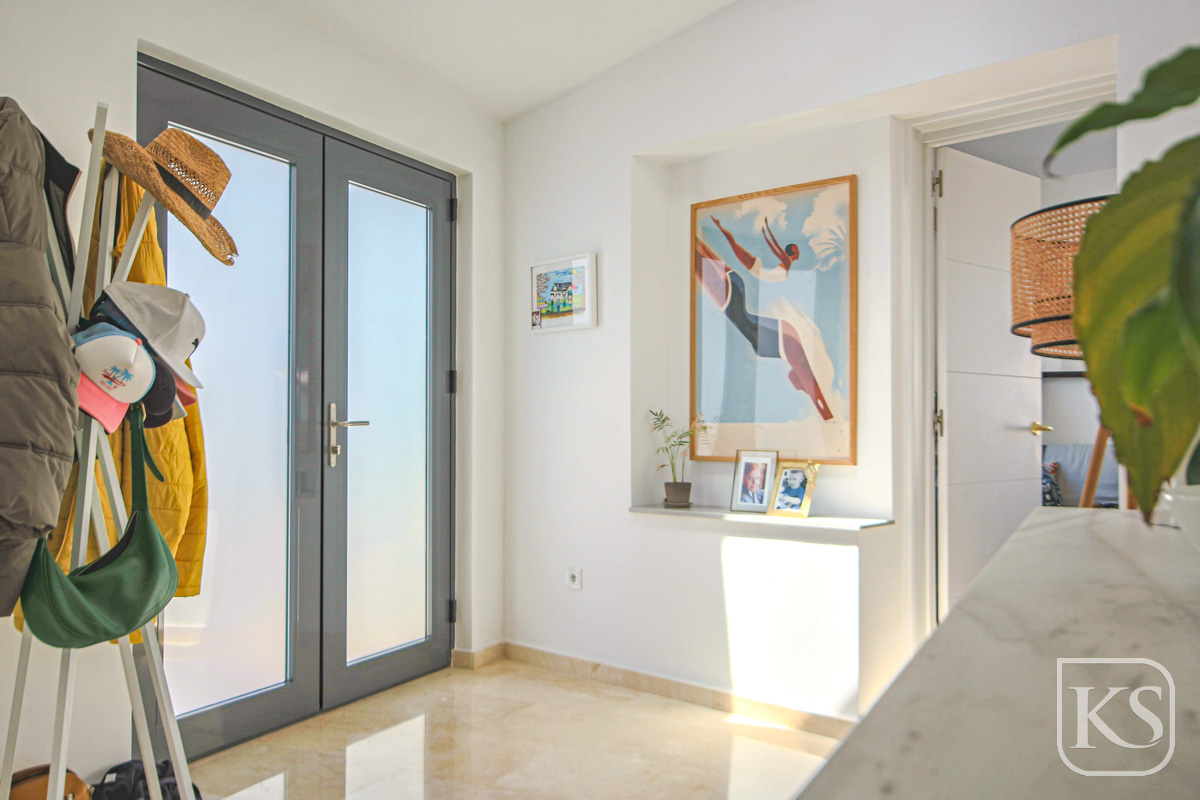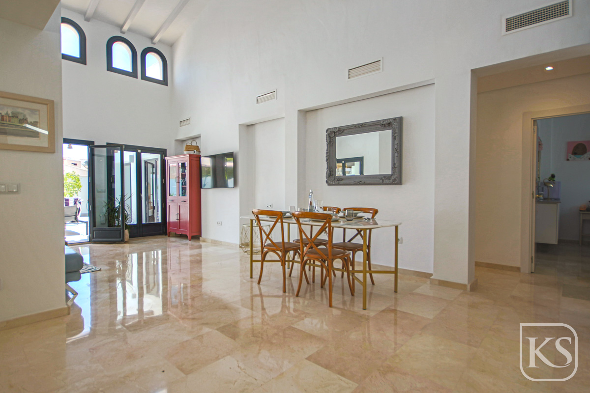 Step inside and feel the bright, airy ambience created by the fresh renovation, new tiling, and carefully curated décor. The villa features an extended entrance hallway leading into a spacious open-plan kitchen, living, and dining area.