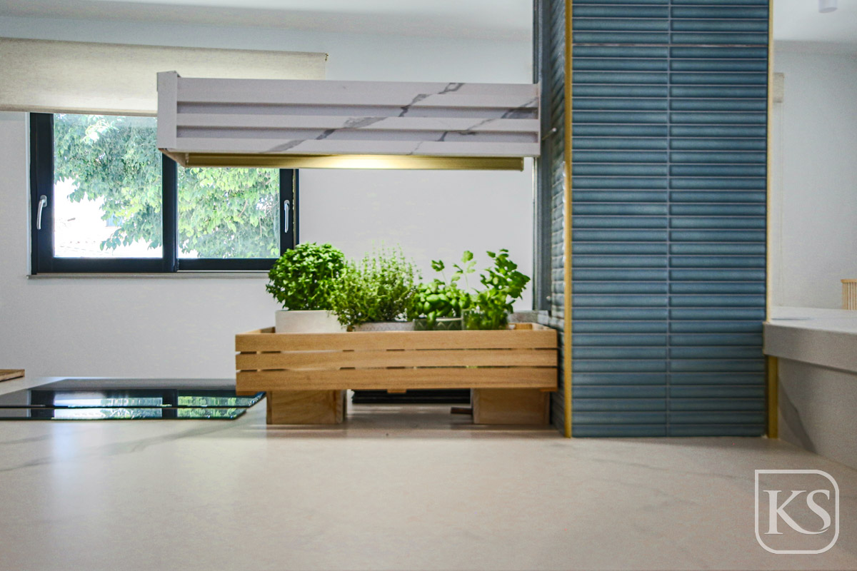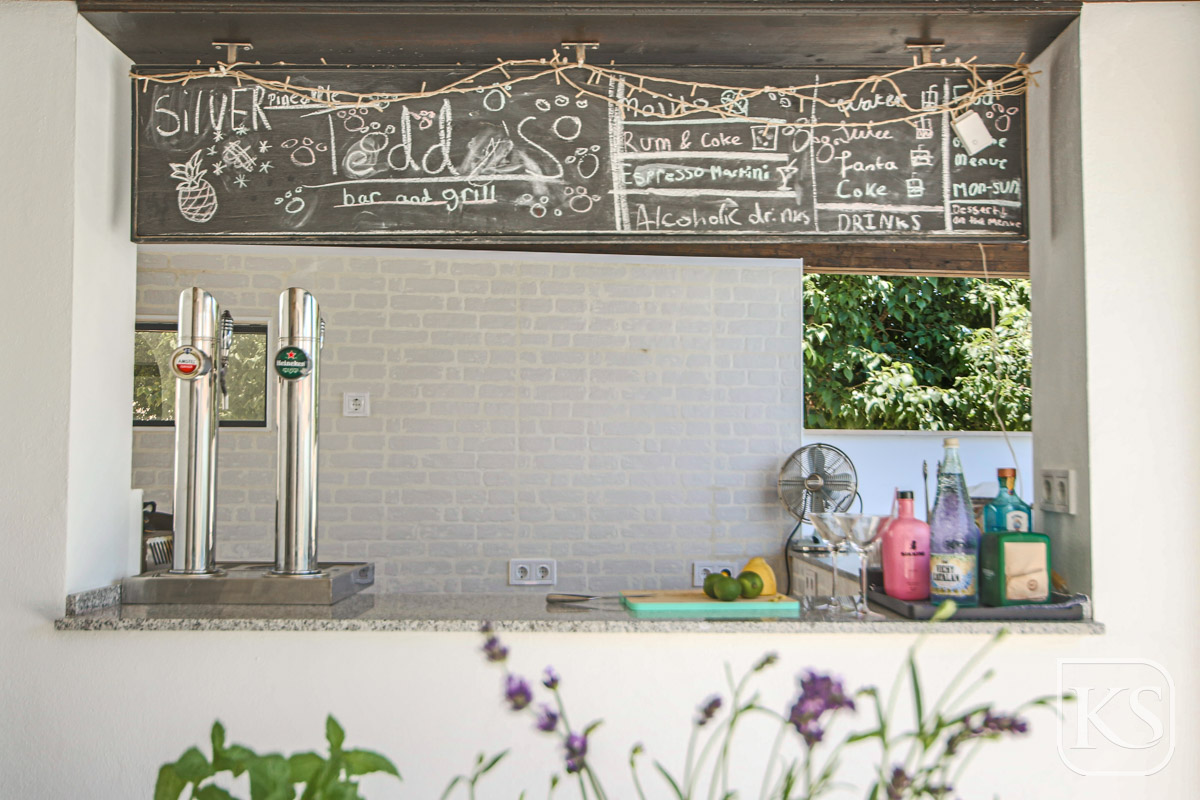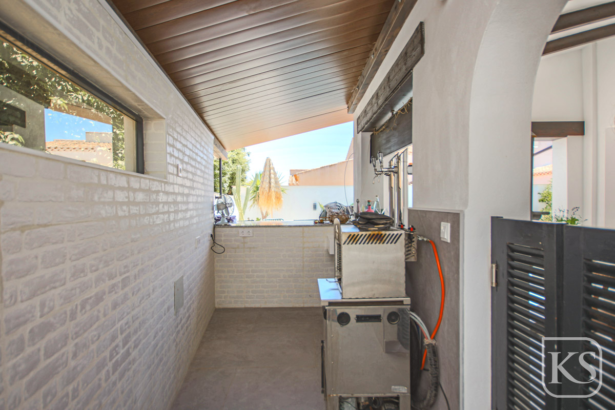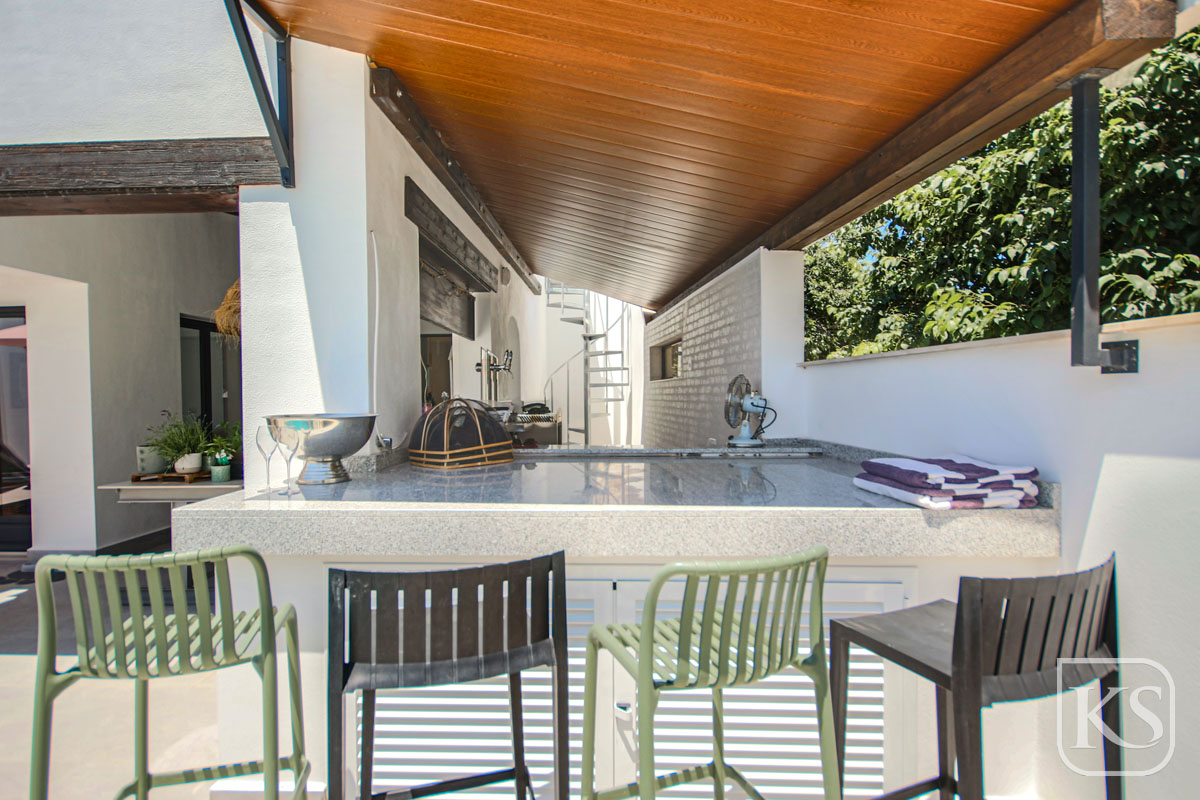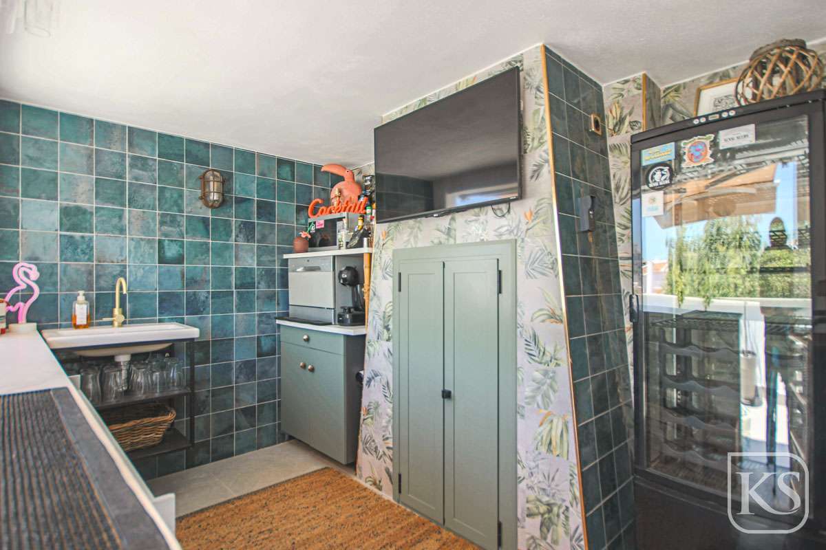 The kitchen is incredibly large and well-equipped, including herb lighting, modern appliances, and a separate laundry room for extra convenience. From the kitchen, large glass bi-folding doors open onto a covered terrace featuring a chic bar area, dining table with lampshade, and a retiled brick BBQ – perfect for relaxing or entertaining.