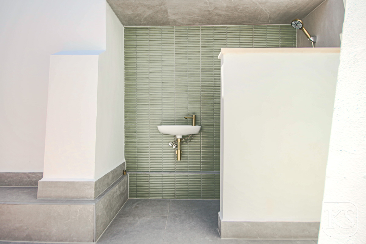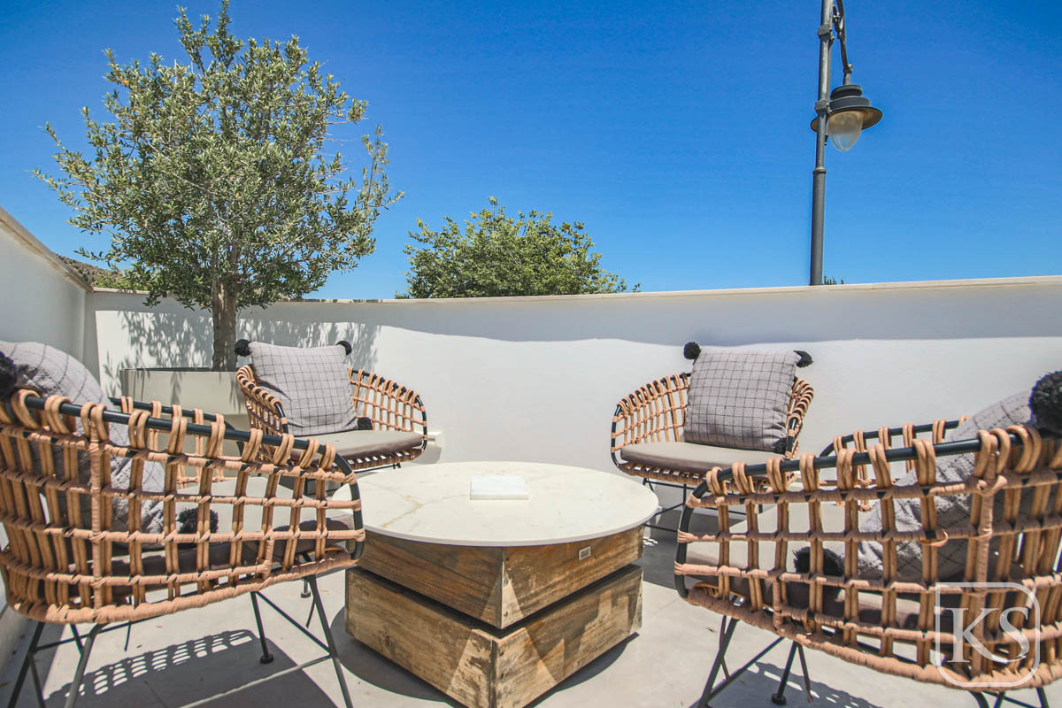 The south-facing private pool is framed by a relaxing lounge area beneath a pergola, complete with mist sprinklers to keep you cool on hot summer days. This outdoor space was designed for comfort, convenience, and making the most of the Mediterranean climate.