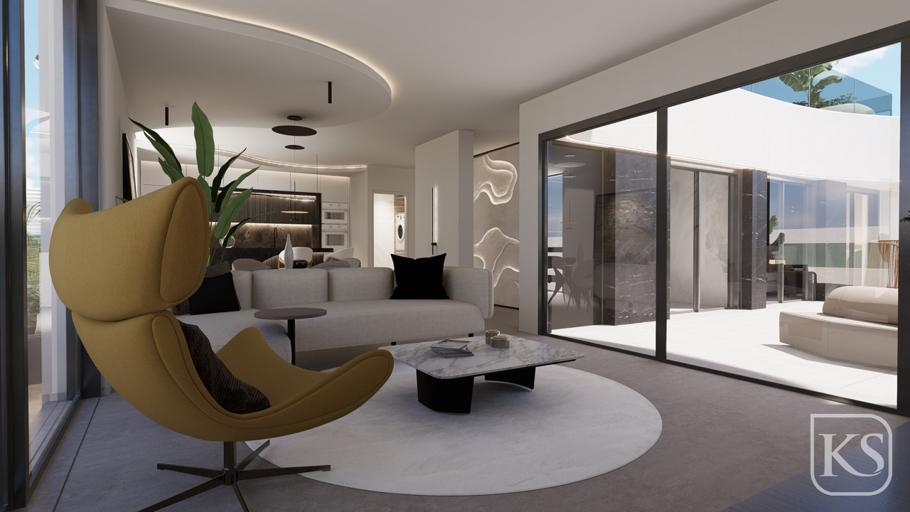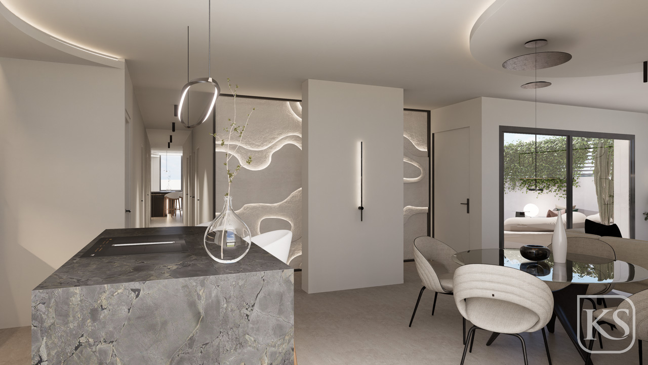 Step into the expansive open-plan living area, characterized by minimalist aesthetics and abundant natural light. The integrated kitchen, dining, and living space create a seamless flow, ideal for entertaining guests or enjoying intimate family moments. Large sliding doors provide effortless access to the pool and terrace, blurring the lines between indoor comfort and outdoor serenity.