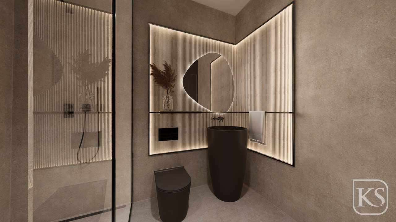 Indulge in luxury with two sleek bathrooms adorned with designer fixtures and premium porcelain stoneware. The ensuite bathroom in the master suite features a stylish shower, countertop washbasin, and chrome-finished fittings, elevating your daily routines to a spa-like experience.